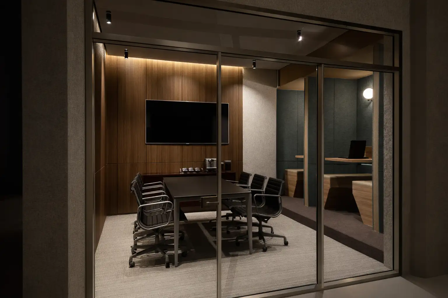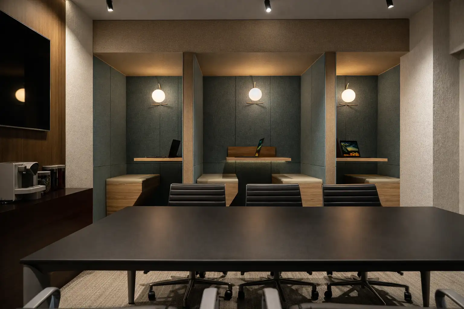 Uso de paneles MDF estilo "slat wood", separadores acústicos, piso alfombrado en zona de enfoque y mesas flotantes ancladas a pared.