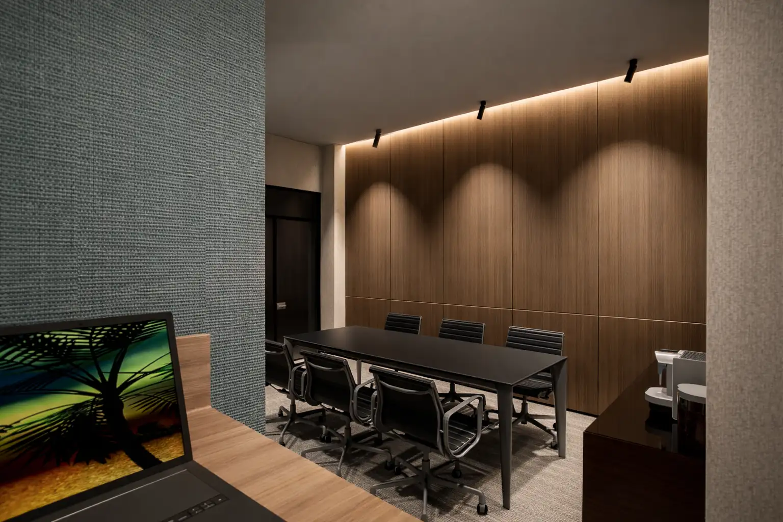 Un diseño minimalista corporativo que invita a la concentración. Cada textura fue seleccionada para crear una atmósfera de tranquilidad y profesionalismo.